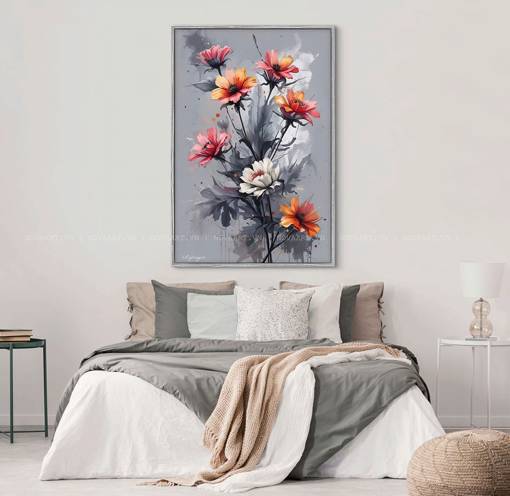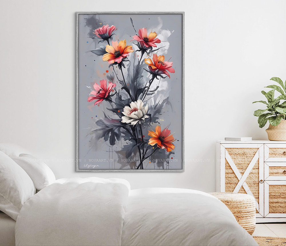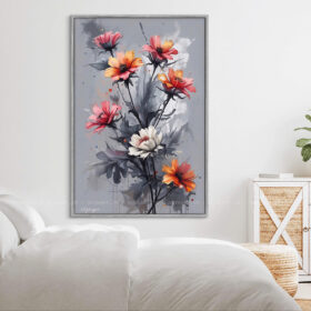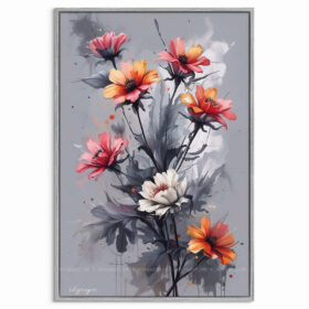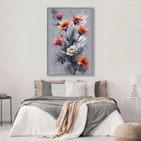 Loài hoa tượng trưng cho sự lạc quan, bền bỉ và sức sống mãnh liệt. Với gam màu nổi bật gồm cam, hồng và trắng trên nền xám trung tính, tranh hoa cúc mang đến cảm giác tươi mới nhưng vẫn đầy chiều sâu nghệ thuật.