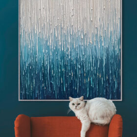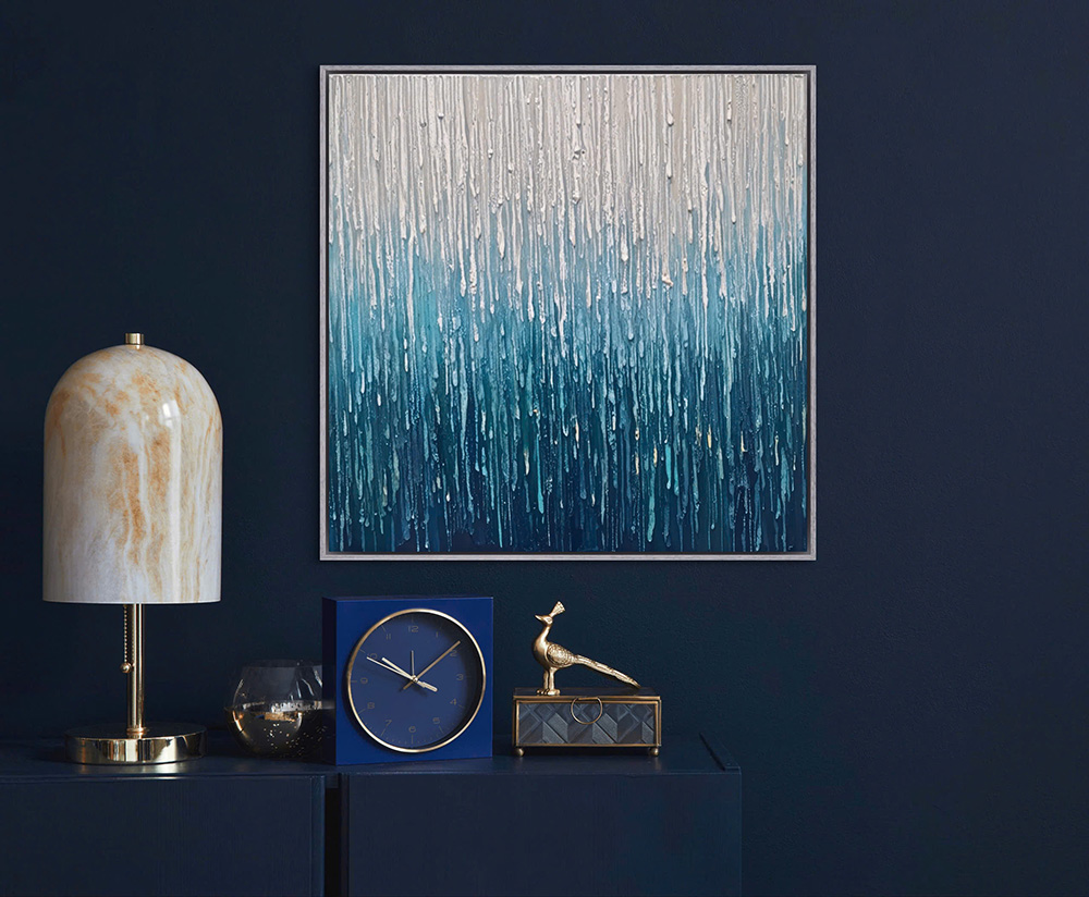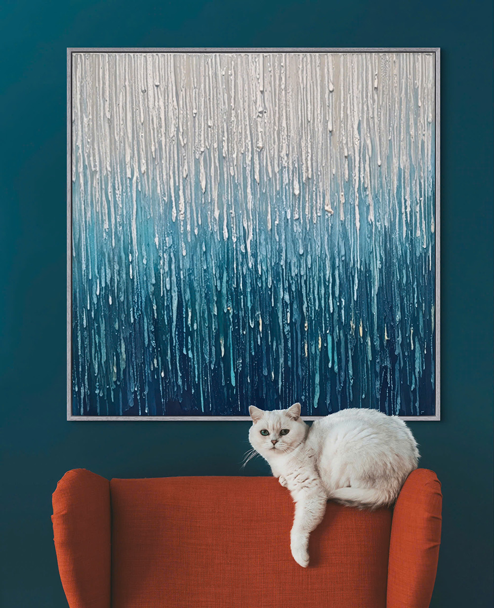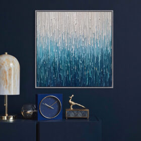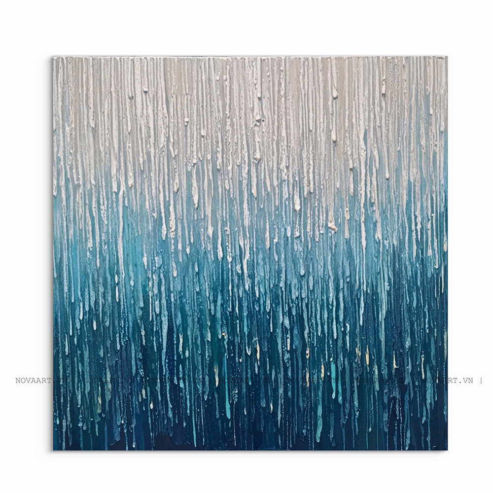 “Tiếng Mưa” Bức tranh mang đến một cảm giác tĩnh lặng, an yên, như thể đang đứng dưới màn mưa lặng lẽ suy tư. Mỗi giọt mưa như một nhịp chậm của cuộc sống gột rửa những lo toan và mời gọi người ta quay về bên trong. Bức tranh phù hợp trao không gian phòng khách, sảnh khách sạn, văn phòng làm viêc…