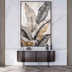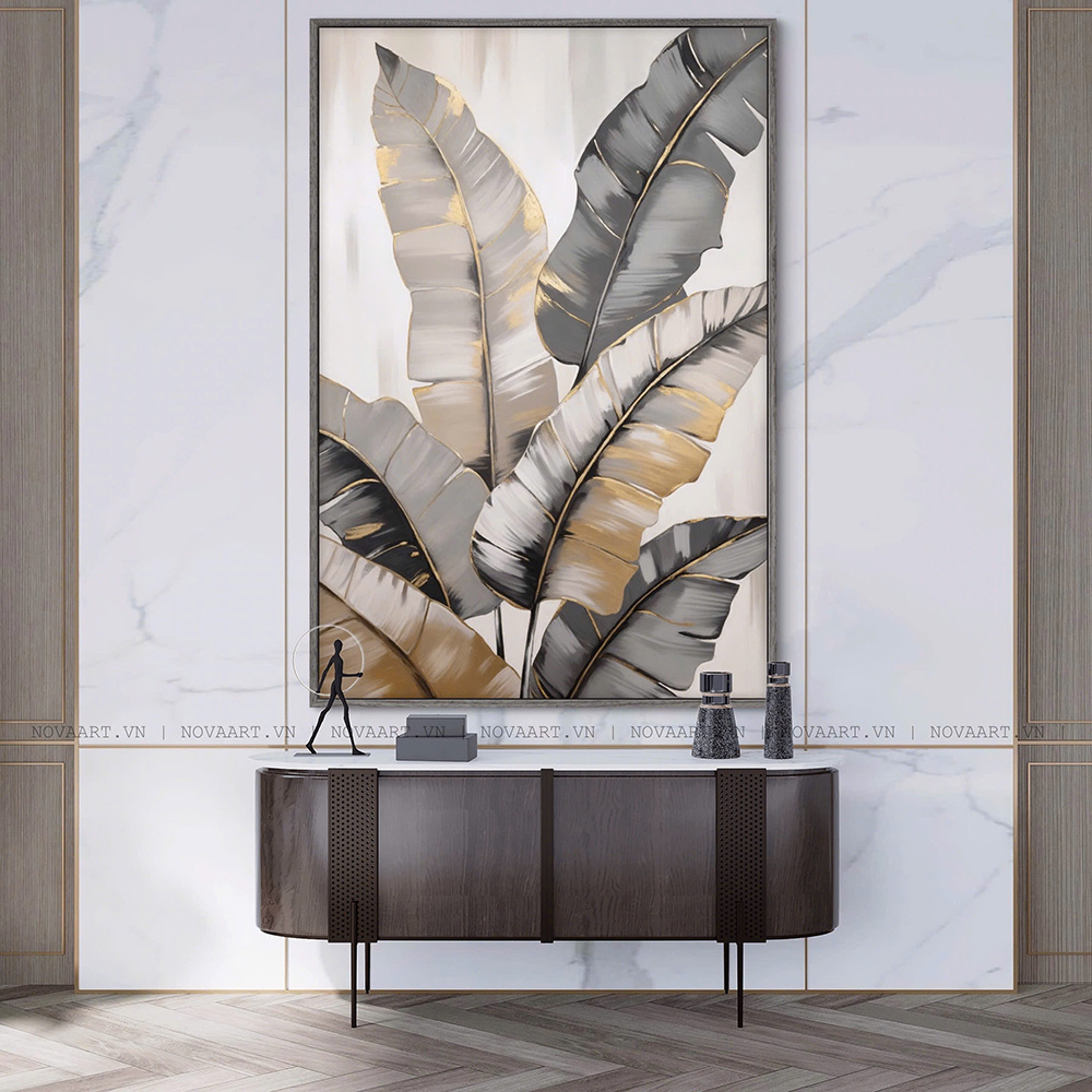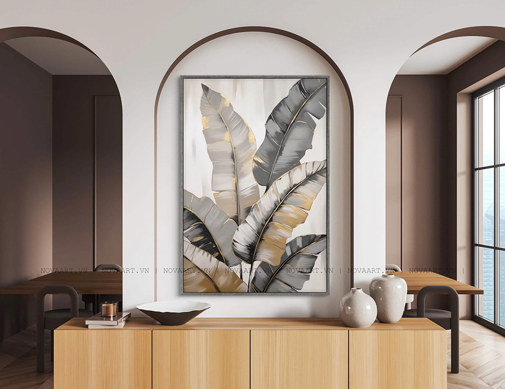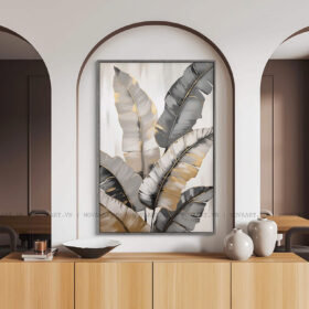 Tranh trừu tượng Lá Nhiệt Đới là sự giao thoa hài hoà giữa vẻ đẹp tự nhiên và ngôn ngữ hình học hiện đại. Với bố cục những chiếc lá lớn được cách điệu theo phong cách trừu tượng, bức tranh mang đến cảm giác mềm mại nhưng vẫn rất cá tính. Sự phối hợp giữa các tông màu xám, be và ánh vàng kim tạo hiệu ứng thị giác sang trọng, tinh tế mà dịu mắt. Những đường viền ánh kim như những vệt sáng nhẹ, vừa gợi sự sống động của lá, vừa tạo chiều sâu và điểm nhấn ấn tượng cho tổng thể.